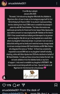“This week, I introduced my daughter Mitchelle Anu Adeleke to Nigerians after a 6-year break on the Instagram page built for her 5th birthday by Dr. Kemi in 2018. To my shock, I read several blog stories claiming that I had 2 DNA tests to establish Anuoluwapo’s paternity with Mr. David Adeleke.