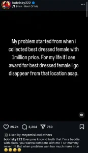 “My problems started when I won *Best Dressed Female* and took the ₦1 million prize. From now on, if I see any award for *Best Dressed Female,* I will disappear from the location immediately. Everyone knows I’m a baddie with class. Compete with me? Your mummy never! But when problems get too much, I have to run,” he wrote.