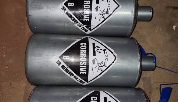 “On conducting a thorough search, the suspect was found in possession of three (3) metal jars of silver liguid mercury, each weighing 34.5kg, with a total market value of 2,800,000 C F A, French currency, equivalent to Seven Million Five Hundred Thousand Naira (# 7,500,000:00), reasonably suspected to have been illegally imported into Nigeria without a valid license or registration.