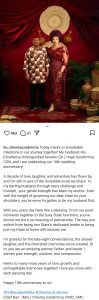 “Di m, you are an amazing partner, father, and leader. I admire your strength, wisdom, and compassion. Here’s to many more years of love, growth, and unforgettable memories together! I love you more with each passing day. Happy 10th anniversary to us!”