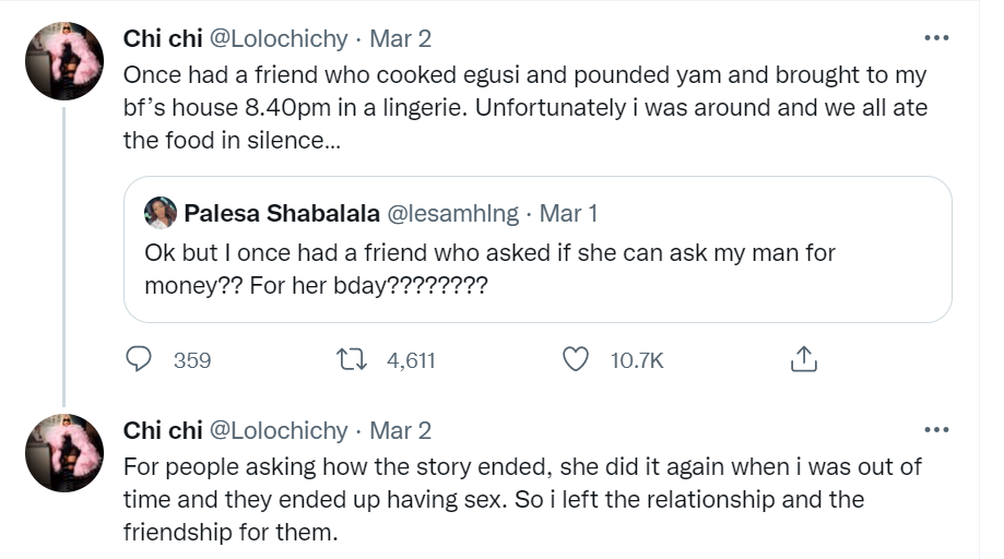 According to @Lolochichy, it first started after her friend cooked egusi and pounded yam and brought it to her boyfriend’s house around 8.40pm in lingerie. She disclosed that she was around the first time and they ate it in silence.