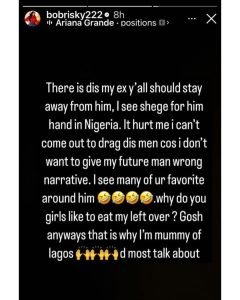 She wrote, “Only in Nigeria will you dump a man, and he’ll get angry and start messing you up using his connections. There is this my ex, y’all should stay away from him. It hurts me I can’t come out to drag these men because I don’t want to give my future man the wrong impression.”