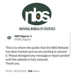 The National Bureau of Statistics (NBS) has reported that its official website has been compromised by hackers.