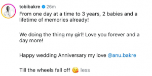 Actor Tobi Bakre and his wife, Anu, are celebrating their third wedding anniversary.
