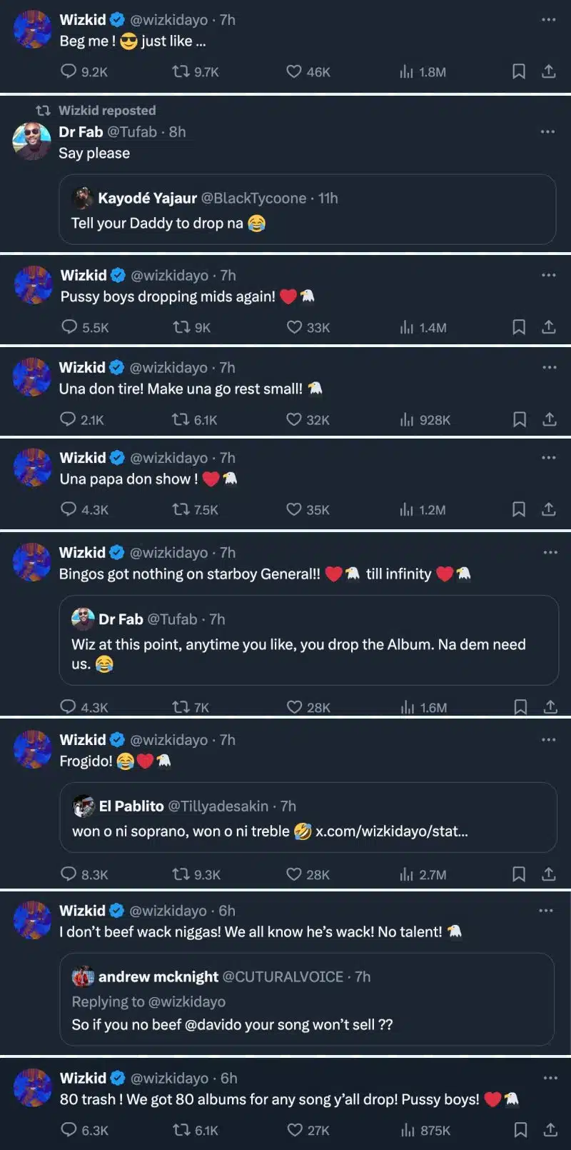 Wizkid, however, dashed to the X platform in multiple posts to bash Davido’s upcoming single, stating, “Pussy boys dropping mids again! ❤️🦅.”